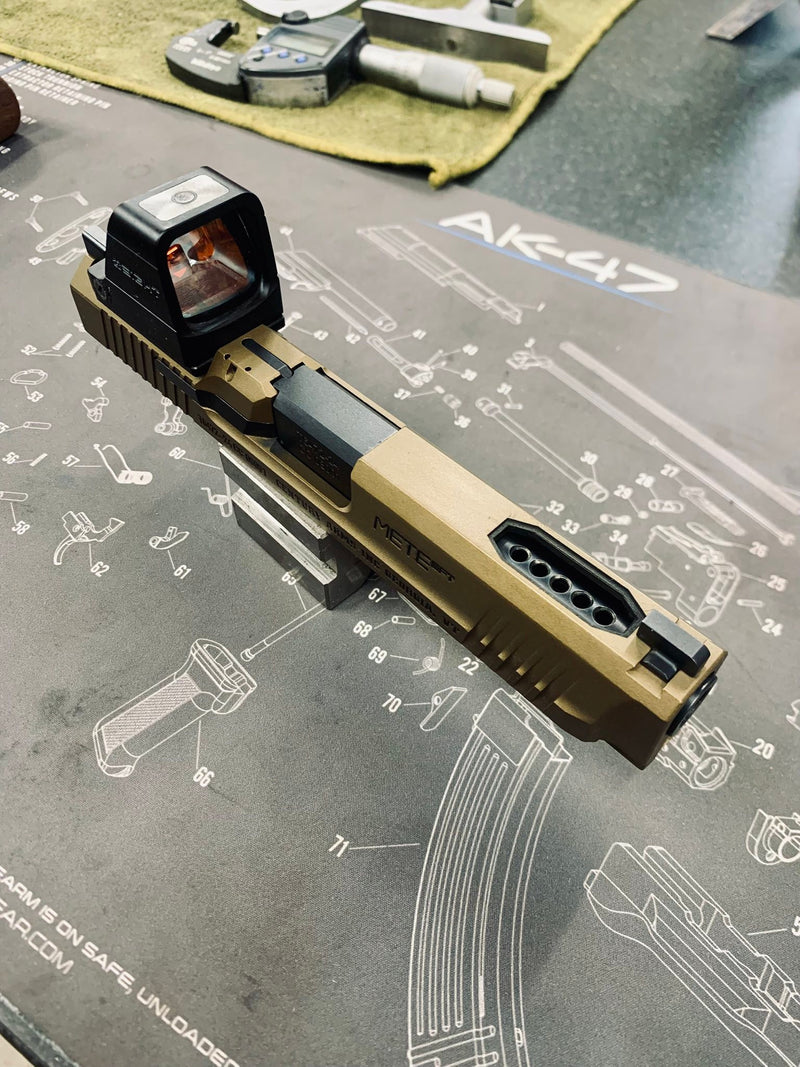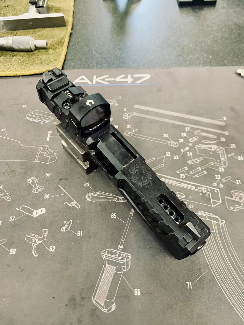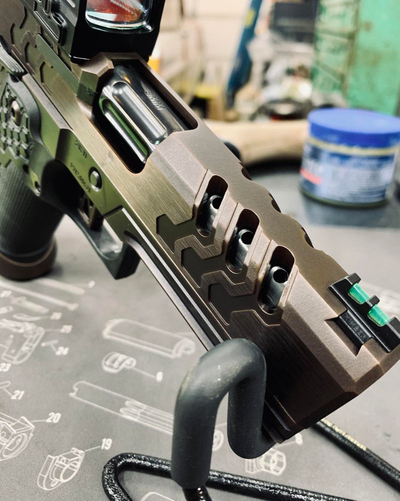 7 port linear porting with chamfered window, front sight moved back, chunk port and Cerakote.