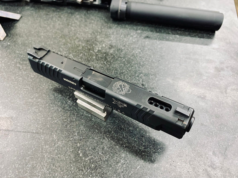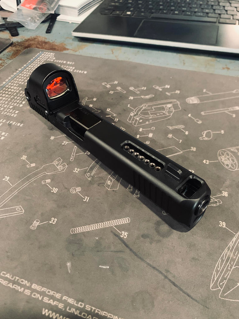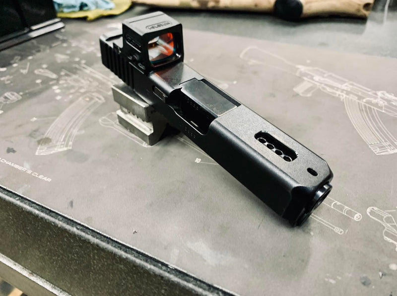 Barrel ported through factory cut slide serrations.